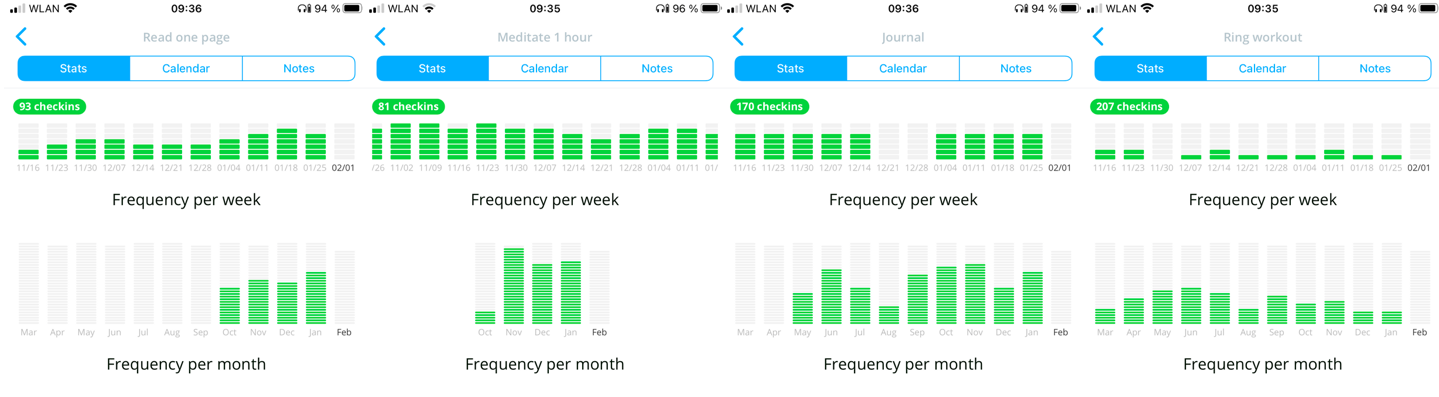 And truth be told, tracking my habits has helped me greatly throughout the years by supporting me to stay consistent over longer periods of time. It has helped shape my identity as someone with self-discipline. Through tracking my workouts, Iāve managed to get physically stronger. I finally have a reading habit. It has supported my journaling, which, now a year on,Ā has increased my self-awareness and made me comfortable with expressing myself in words (not sure I wouldāve started blogging had I not journaled first). And all this has greatly improved my self-esteem and made me feel like I can rely on myself.