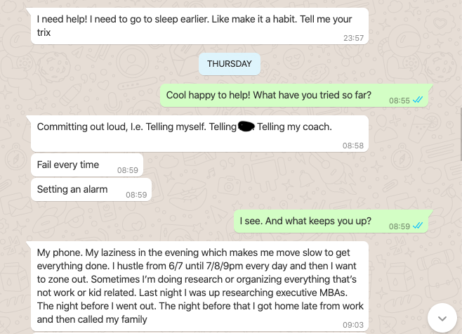 Here’s another example; Recently a good friend of mine wrote to me to ask for advice on how to build a better sleeping routine. Here’s how the conversation started: